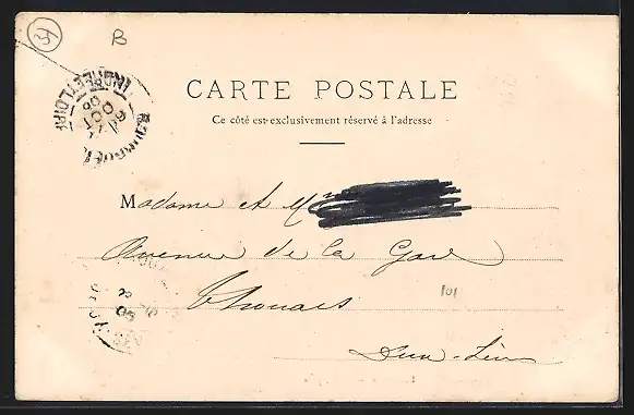 Personenbezogene Daten auf der Rückseite der Karte wurden durch blauen Textmarker unkenntlich gemacht. Die blauen Stellen sind auf die Vorderseite durchgeweicht und wirken sich negativ auf das Postkartenfoto aus