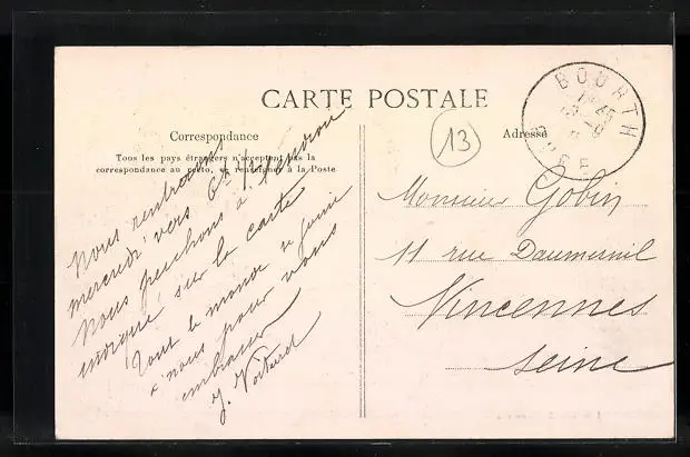 Personenbezogene Daten auf der Rückseite der Karte wurden durch blauen Textmarker unkenntlich gemacht. Die blauen Stellen sind auf die Vorderseite durchgeweicht und wirken sich negativ auf das Postkartenfoto aus