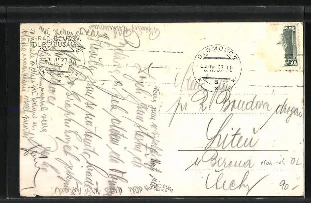 gelaufen 1937, Briefmarke tw. entfernt, Eckknicke li. oben u. re. unten, minimaler Einriss re. unten, Stempelspur, guter Zustand