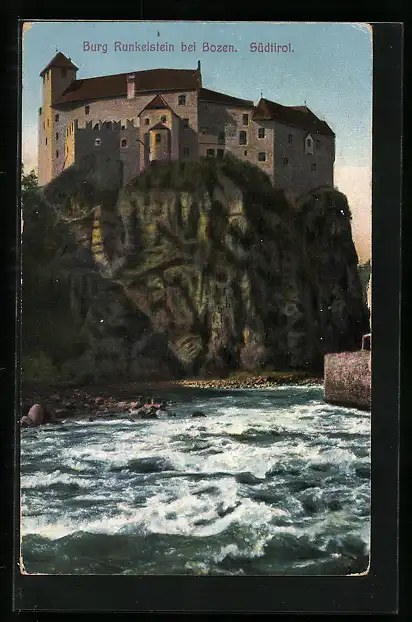AK Bozen, Blick auf Burg Runkelstein vom Fluss aus