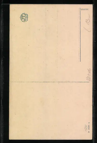 Personenbezogene Daten auf der Rückseite der Karte wurden durch blauen Textmarker unkenntlich gemacht. Die blauen Stellen sind auf die Vorderseite durchgeweicht und wirken sich negativ auf das Postkartenfoto aus