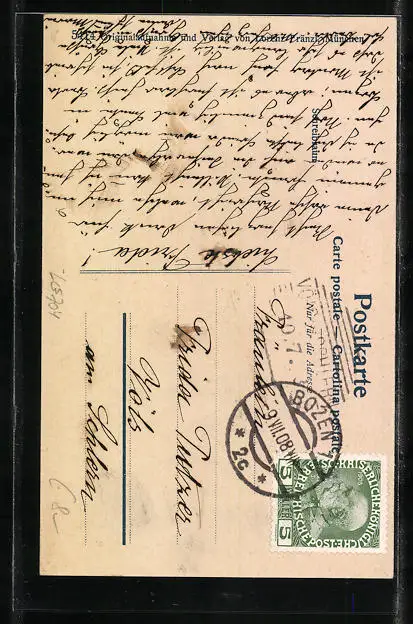gelaufen 1908, Eckknick unten rechts, guter Zustand