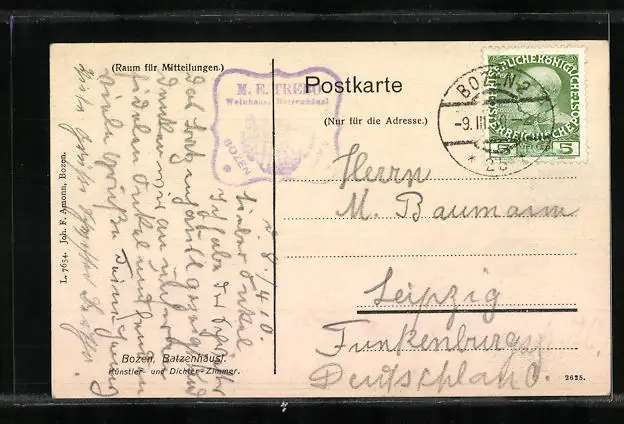 AK Bozen, Gasthaus Batzenhäusl, Künstler- und Dichter-Zimmer