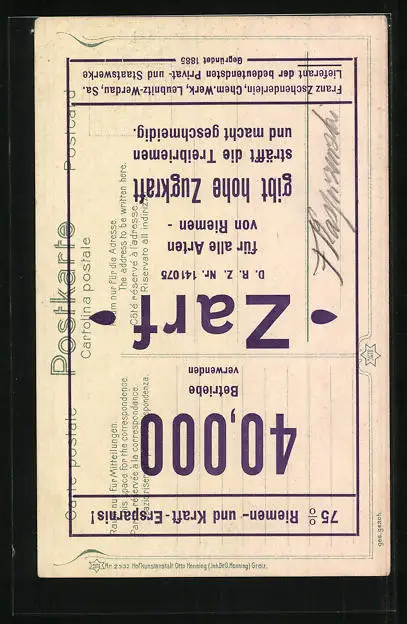 Personenbezogene Daten auf der Rückseite der Karte wurden durch blauen Textmarker unkenntlich gemacht. Die blauen Stellen sind auf die Vorderseite durchgeweicht und wirken sich negativ auf das Postkartenfoto aus