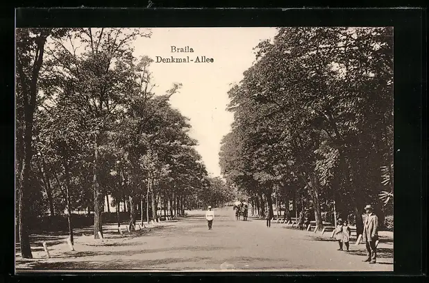 AK Braila, Denkmal-Allee mit Passanten