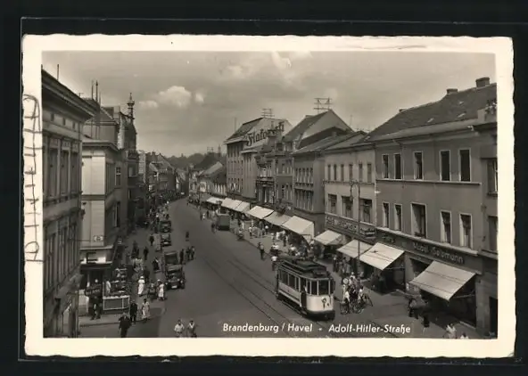 AK Brandenburg / Havel, Hauptstrasse mit Geschäften und Strassenbahn