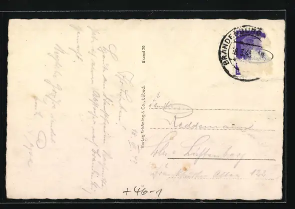 Personenbezogene Daten auf der Rückseite der Karte wurden durch blauen Textmarker unkenntlich gemacht. Die blauen Stellen sind auf die Vorderseite durchgeweicht und wirken sich negativ auf das Postkartenfoto aus
