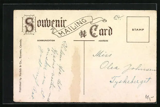 Personenbezogene Daten auf der Rückseite der Karte wurden durch blauen Textmarker unkenntlich gemacht. Die blauen Stellen sind auf die Vorderseite durchgeweicht und wirken sich negativ auf das Postkartenfoto aus