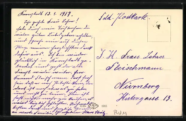 Personenbezogene Daten auf der Rückseite der Karte wurden durch blauen Textmarker unkenntlich gemacht. Die blauen Stellen sind auf die Vorderseite durchgeweicht und wirken sich negativ auf das Postkartenfoto aus