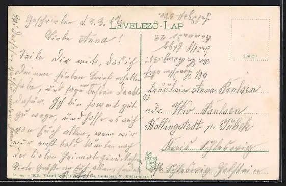 Personenbezogene Daten auf der Rückseite der Karte wurden durch blauen Textmarker unkenntlich gemacht. Die blauen Stellen sind auf die Vorderseite durchgeweicht und wirken sich negativ auf das Postkartenfoto aus
