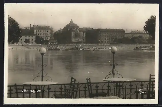 AK Bratislava, Blick von einer Cafe-Terrasse über die Donau