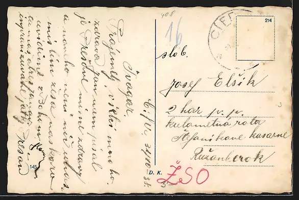 Personenbezogene Daten auf der Rückseite der Karte wurden durch blauen Textmarker unkenntlich gemacht. Die blauen Stellen sind auf die Vorderseite durchgeweicht und wirken sich negativ auf das Postkartenfoto aus
