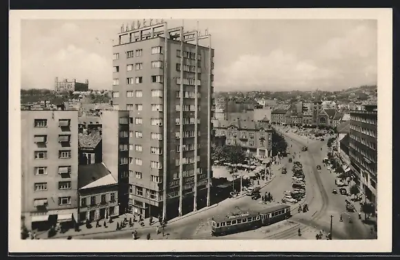 AK Bratislava, Stalinovo nám, Grand Cafe Manderla, Strassenbahn