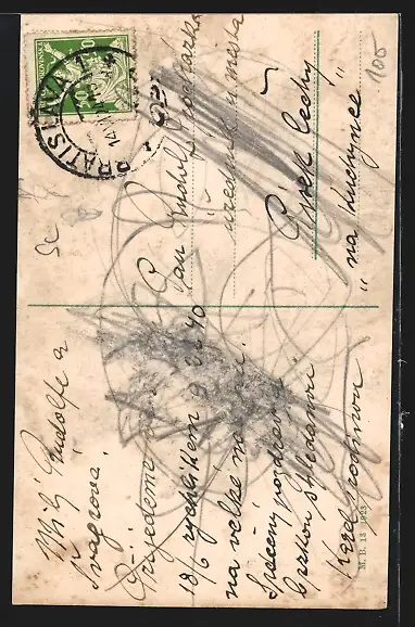 Personenbezogene Daten auf der Rückseite der Karte wurden durch blauen Textmarker unkenntlich gemacht. Die blauen Stellen sind auf die Vorderseite durchgeweicht und wirken sich negativ auf das Postkartenfoto aus