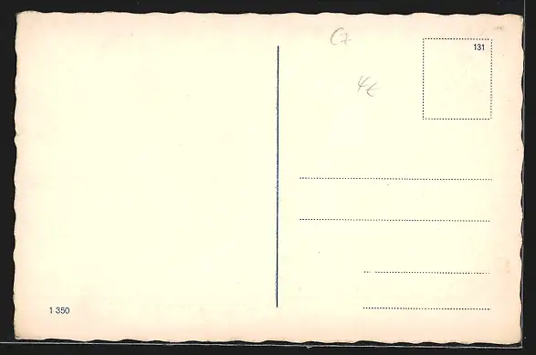 Personenbezogene Daten auf der Rückseite der Karte wurden durch blauen Textmarker unkenntlich gemacht. Die blauen Stellen sind auf die Vorderseite durchgeweicht und wirken sich negativ auf das Postkartenfoto aus