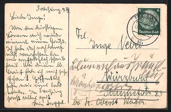Personenbezogene Daten auf der Rückseite der Karte wurden durch blauen Textmarker unkenntlich gemacht. Die blauen Stellen sind auf die Vorderseite durchgeweicht und wirken sich negativ auf das Postkartenfoto aus