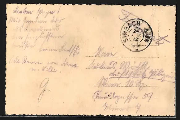 Personenbezogene Daten auf der Rückseite der Karte wurden durch blauen Textmarker unkenntlich gemacht. Die blauen Stellen sind auf die Vorderseite durchgeweicht und wirken sich negativ auf das Postkartenfoto aus