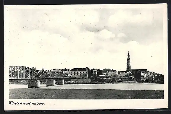 AK Braunau a. Inn, Uferaprtie mit Kirche und Brücke