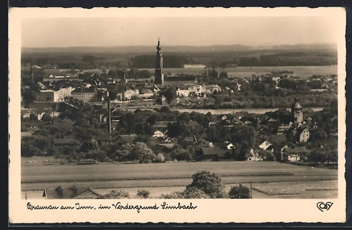 AK Braunau am Inn, Gesamtansicht mit Innbach aus der Vogelschau