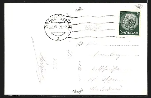 Personenbezogene Daten auf der Rückseite der Karte wurden durch blauen Textmarker unkenntlich gemacht. Die blauen Stellen sind auf die Vorderseite durchgeweicht und wirken sich negativ auf das Postkartenfoto aus