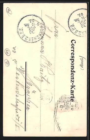 Personenbezogene Daten auf der Rückseite der Karte wurden durch blauen Textmarker unkenntlich gemacht. Die blauen Stellen sind auf die Vorderseite durchgeweicht und wirken sich negativ auf das Postkartenfoto aus
