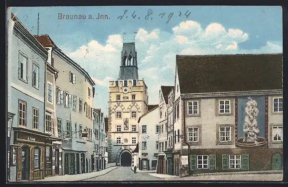 AK Braunau am Inn, Strassenpartie mit Kirche