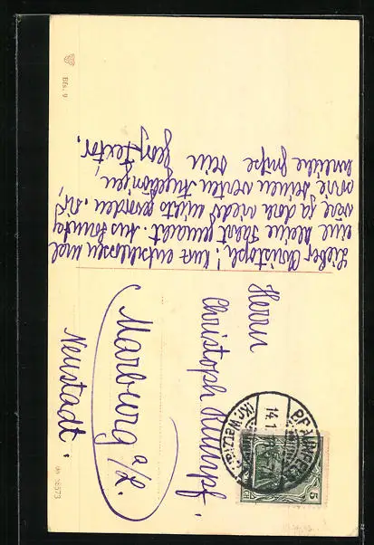 Personenbezogene Daten auf der Rückseite der Karte wurden durch blauen Textmarker unkenntlich gemacht. Die blauen Stellen sind auf die Vorderseite durchgeweicht und wirken sich negativ auf das Postkartenfoto aus