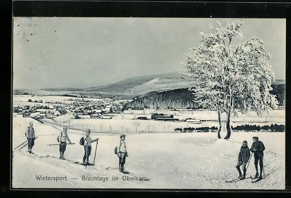 AK Braunlage /Harz, Ortsansicht mit Skiläufern