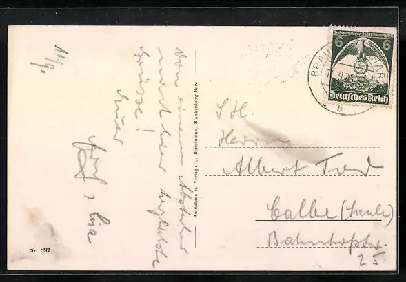 Personenbezogene Daten auf der Rückseite der Karte wurden durch blauen Textmarker unkenntlich gemacht. Die blauen Stellen sind auf die Vorderseite durchgeweicht und wirken sich negativ auf das Postkartenfoto aus