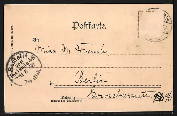 alte Ansichtskarte, gelaufen 1897, Briefmarke entfernt, rückseitig Oberflächenschaden, guter Zustand