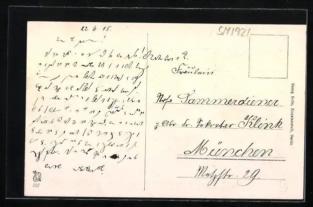 Personenbezogene Daten auf der Rückseite der Karte wurden durch blauen Textmarker unkenntlich gemacht. Die blauen Stellen sind auf die Vorderseite durchgeweicht und wirken sich negativ auf das Postkartenfoto aus