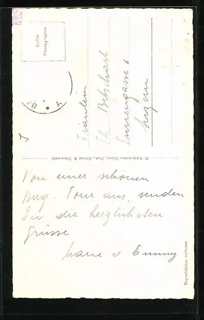 Personenbezogene Daten auf der Rückseite der Karte wurden durch blauen Textmarker unkenntlich gemacht. Die blauen Stellen sind auf die Vorderseite durchgeweicht und wirken sich negativ auf das Postkartenfoto aus