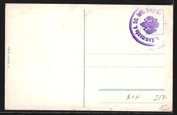 Personenbezogene Daten auf der Rückseite der Karte wurden durch blauen Textmarker unkenntlich gemacht. Die blauen Stellen sind auf die Vorderseite durchgeweicht und wirken sich negativ auf das Postkartenfoto aus