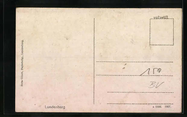 Personenbezogene Daten auf der Rückseite der Karte wurden durch blauen Textmarker unkenntlich gemacht. Die blauen Stellen sind auf die Vorderseite durchgeweicht und wirken sich negativ auf das Postkartenfoto aus