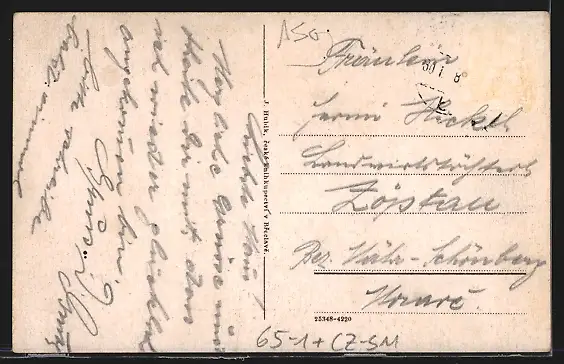 Personenbezogene Daten auf der Rückseite der Karte wurden durch blauen Textmarker unkenntlich gemacht. Die blauen Stellen sind auf die Vorderseite durchgeweicht und wirken sich negativ auf das Postkartenfoto aus