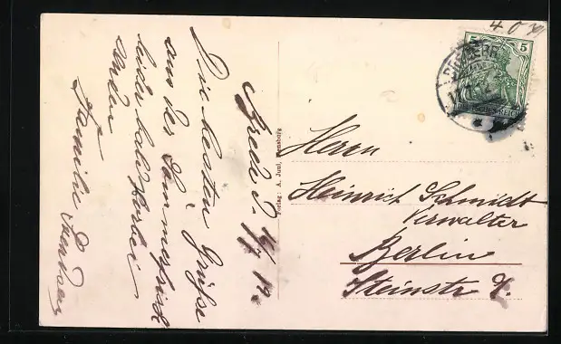 Personenbezogene Daten auf der Rückseite der Karte wurden durch blauen Textmarker unkenntlich gemacht. Die blauen Stellen sind auf die Vorderseite durchgeweicht und wirken sich negativ auf das Postkartenfoto aus