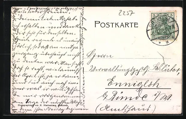 Personenbezogene Daten auf der Rückseite der Karte wurden durch blauen Textmarker unkenntlich gemacht. Die blauen Stellen sind auf die Vorderseite durchgeweicht und wirken sich negativ auf das Postkartenfoto aus