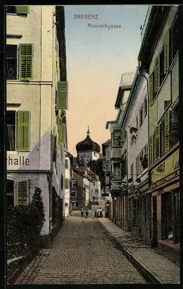 AK Bregenz, Blick in die Maurachgasse mit Geschäften