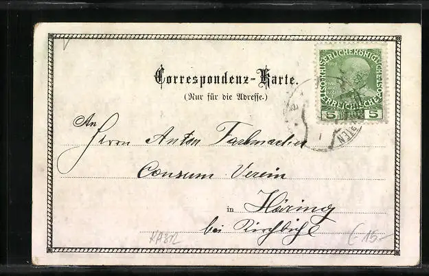 Personenbezogene Daten auf der Rückseite der Karte wurden durch blauen Textmarker unkenntlich gemacht. Die blauen Stellen sind auf die Vorderseite durchgeweicht und wirken sich negativ auf das Postkartenfoto aus