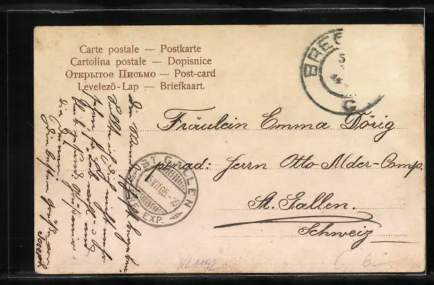 gelaufen 1905, Briefmarke entfernt, rückseitig Oberflächenschaden, Eckknicke li. unten, guter Zustand