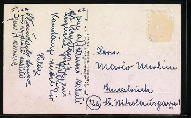 alte Ansichtskarte, gelaufen, Briefmarke entfernt, rückseitig Oberflächenschaden, Bugspuren oben li., guter Zustand