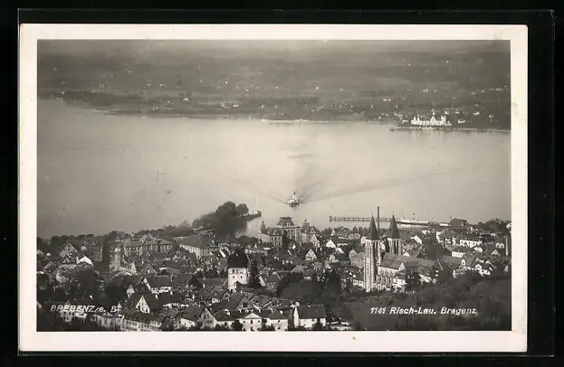 AK Bregenz, Luftbild von Stadt und Bodensee