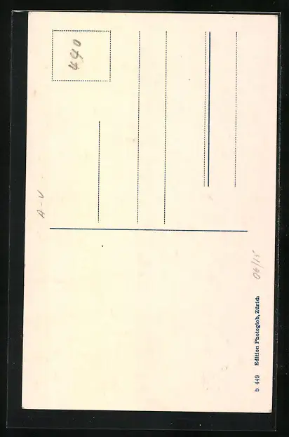 Personenbezogene Daten auf der Rückseite der Karte wurden durch blauen Textmarker unkenntlich gemacht. Die blauen Stellen sind auf die Vorderseite durchgeweicht und wirken sich negativ auf das Postkartenfoto aus
