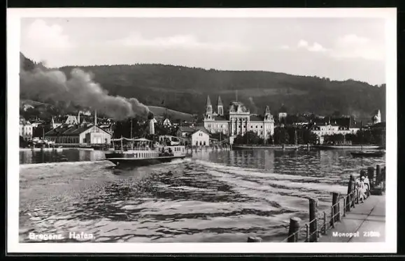 AK Bregenz, Raddampfer hält im Hafen der Stadt
