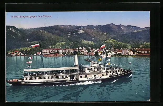 AK Bregenz, Salonddampfer Stadt Bregenz mit Flaggengala in voller Fahrt