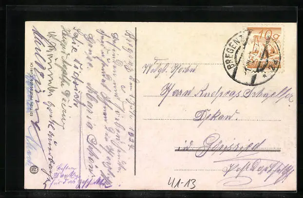 Personenbezogene Daten auf der Rückseite der Karte wurden durch blauen Textmarker unkenntlich gemacht. Die blauen Stellen sind auf die Vorderseite durchgeweicht und wirken sich negativ auf das Postkartenfoto aus