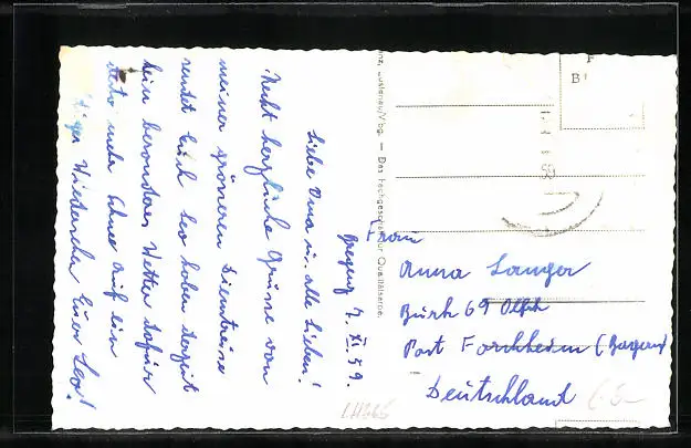Personenbezogene Daten auf der Rückseite der Karte wurden durch blauen Textmarker unkenntlich gemacht. Die blauen Stellen sind auf die Vorderseite durchgeweicht und wirken sich negativ auf das Postkartenfoto aus