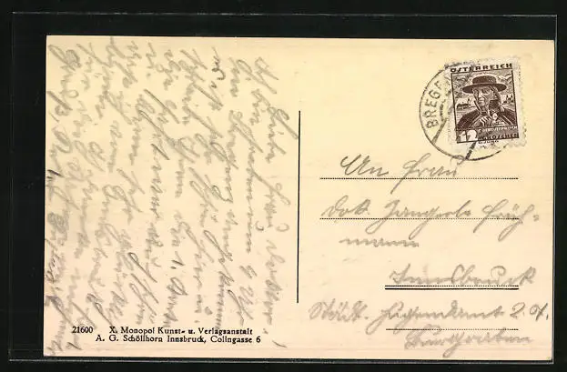 Personenbezogene Daten auf der Rückseite der Karte wurden durch blauen Textmarker unkenntlich gemacht. Die blauen Stellen sind auf die Vorderseite durchgeweicht und wirken sich negativ auf das Postkartenfoto aus
