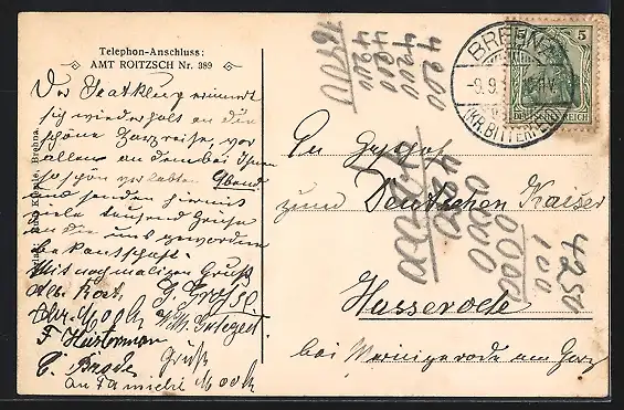 Personenbezogene Daten auf der Rückseite der Karte wurden durch blauen Textmarker unkenntlich gemacht. Die blauen Stellen sind auf die Vorderseite durchgeweicht und wirken sich negativ auf das Postkartenfoto aus