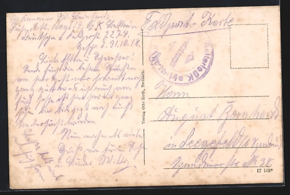 Personenbezogene Daten auf der Rückseite der Karte wurden durch blauen Textmarker unkenntlich gemacht. Die blauen Stellen sind auf die Vorderseite durchgeweicht und wirken sich negativ auf das Postkartenfoto aus